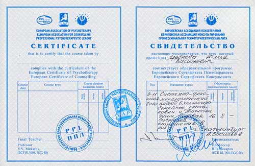 Обратите внимание на номер свидетельства — 003-Ек. Это первый выпуск расстановщиков Института Консультирования и Системных Решений (ИКСР) в городе Екатеринбурге.